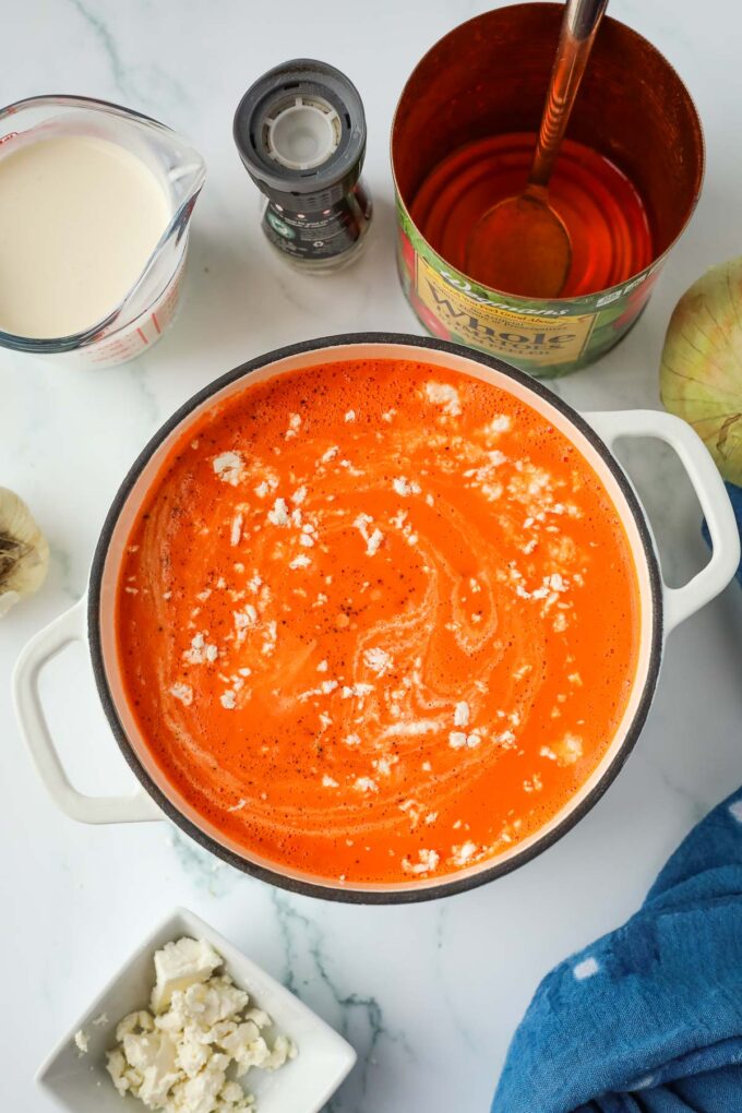 - Carefully transfer to a blender, add the heavy cream and feta, and blend until smooth.