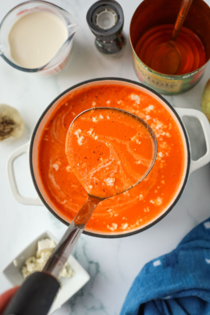 This tomato feta soup is cozy, flavorful, and easy to make. Pair this rich and creamy soup with your favorite grilled cheese sandwich!