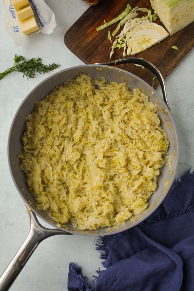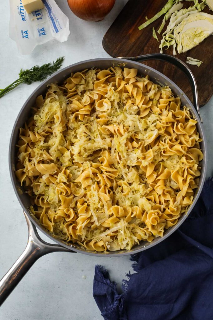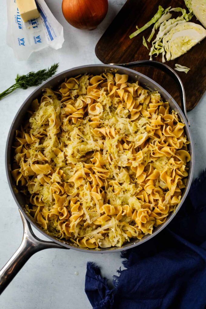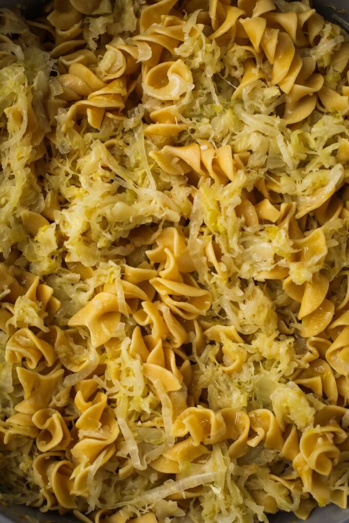 - Turn off heat, add the cabbage mixture and remaining 2 tablespoons butter to the noodles. Toss until the butter is melted and everything is well combined.