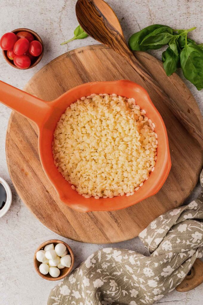 - Bring a large pot of salted water to a boil. Once boiling, cook the pastina according to package directions until al dente. Drain and add to a bowl. Allow to cool to room temperature. If you are short on time, you can rinse the pasta under cold water in a strainer before adding it to your bowl.