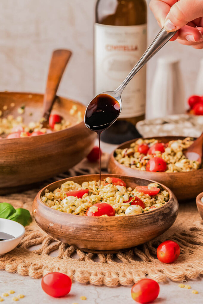 I love pasta salad for make-ahead lunches and lately I’ve been enjoying this pastina salad. I still had some pastina in my pantry so I decided to make this variation using mozzarella, pesto, and balsamic glaze. Pastina is often used in cozy soups like this vegan pastina soup, but in this recipe, it shines in pasta salad. The tiny pasta shape is perfect for scooping up pesto and mingling with tomatoes and mozzarella, so every bite is balanced and flavorful.