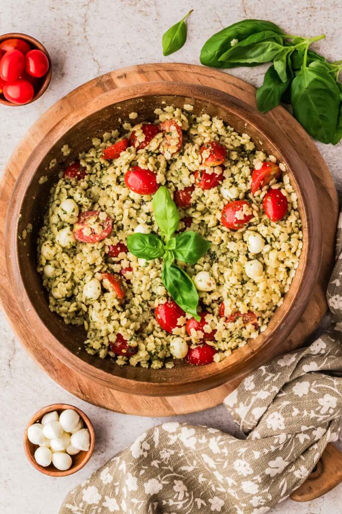This pastina salad is a twist on pasta salad using classic caprese ingredients! It’s made with juicy cherry tomatoes, creamy mozzarella, and herby pesto, tossed with tiny pastina for a light but satisfying pasta salad.