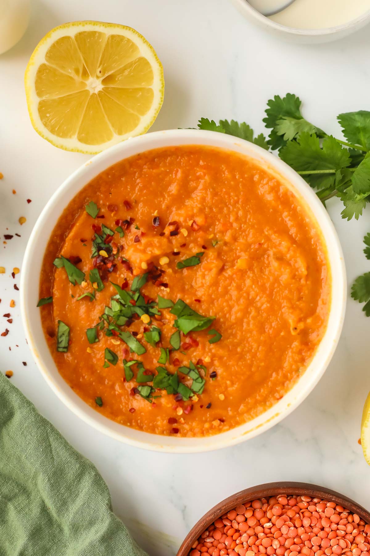 This carrot and red lentil soup is creamy, cozy, and surprisingly hearty, but still light enough for an easy lunch or weeknight dinner. Red lentils cook quickly, the carrots add natural sweetness, and the spices add plenty of flavor. This soup is simple, nourishing, and totally satisfying.