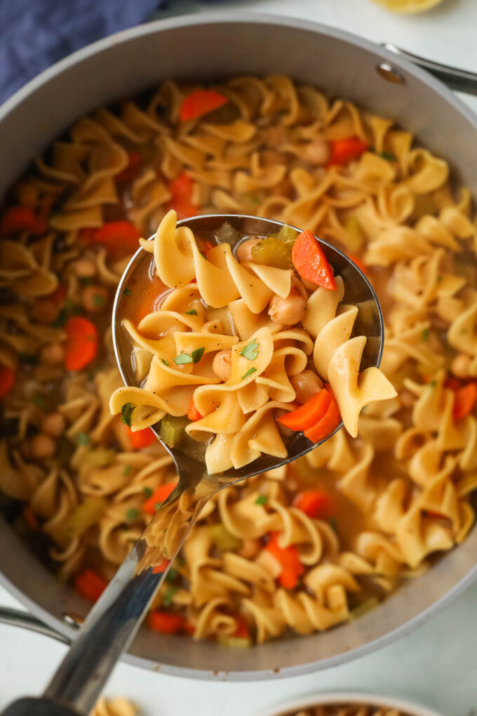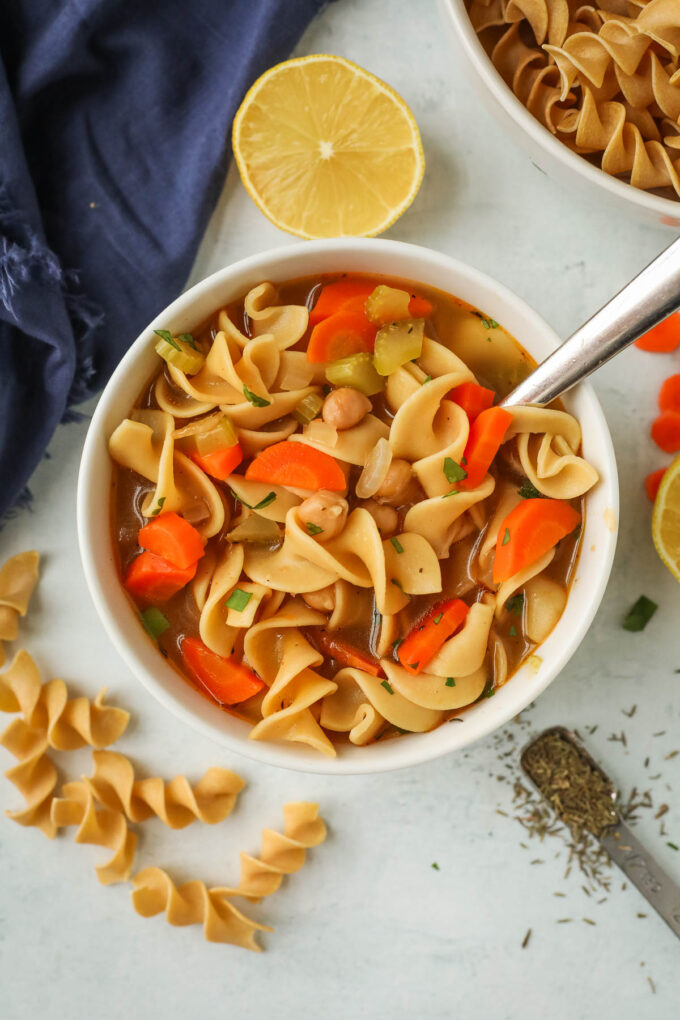 When I was in elementary school, I loved chicken noodle soup. And by chicken noodle soup I mean the kind that came condensed in a can with those weird pieces of “chicken” in it. But I wasn’t the only one who regularly ate this soup. My dad was also an avid chicken noodle soup eater… and I may have hidden cans of soup in the back of the pantry so I could be sure I always had one available. I was so sneaky. Oh, how things have changed. I haven’t had chicken in nearly 20 years but I still love the flavors of a cozy noodle soup. I used chickpeas instead of chicken but this recipe is just as delicious as the classic soup!