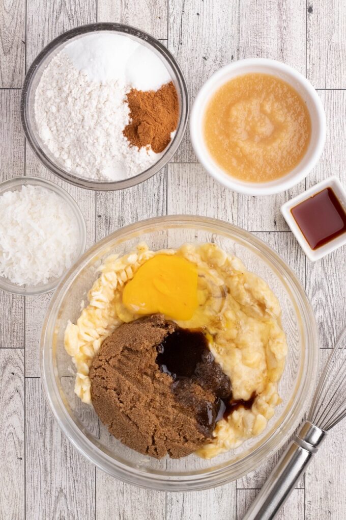 - In a large bowl, mix the mashed bananas, brown sugar, egg, applesauce, and vanilla. Add the dry ingredients and stir just until combined. Fold in the shredded coconut.