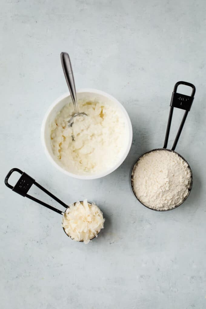 - All-purpose flour: You’ll need ¾ to 1 cup, depending on how wet your cottage cheese is. Start with less and add more as needed.