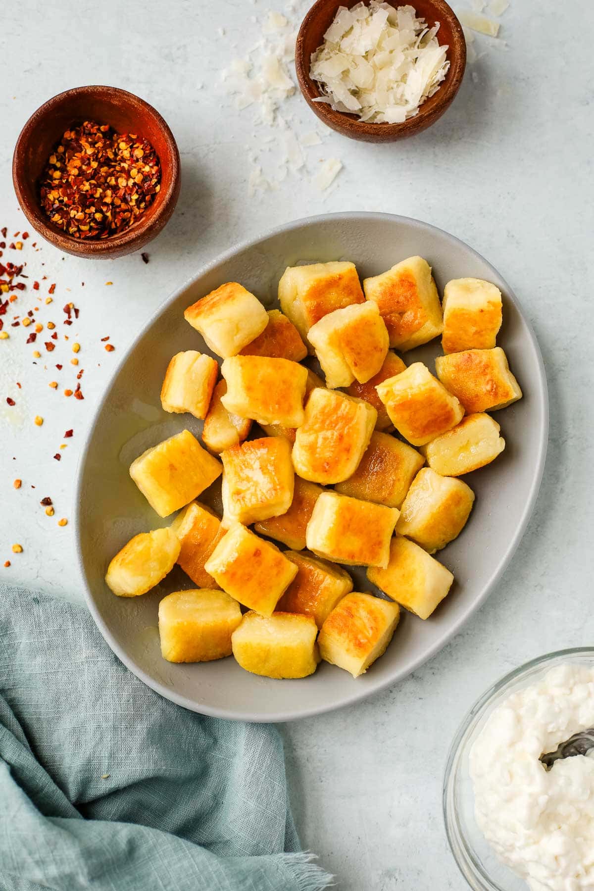 - Cottage cheese: I recommend 4% milk fat for the creamiest results. I love the Good Culture brand, but Breakstone’s and Trader Joe’s both work great too. Some brands can be overly sour (like the Kroger store brand) and it can give the gnocchi an off-flavor. That’s why I recommend Good Culture if you can find it. Fat-free cottage cheese won’t give you the same texture, so I’d skip it here.