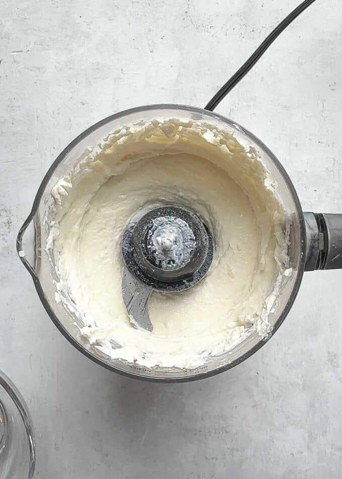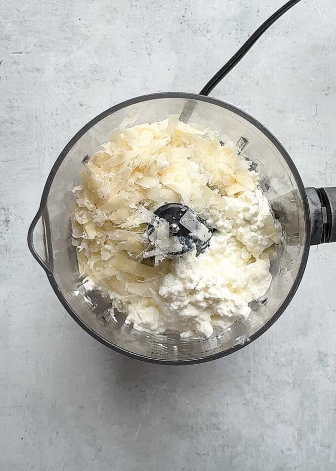 - Add the cottage cheese and Parmesan to a food processor and blend until smooth and creamy.