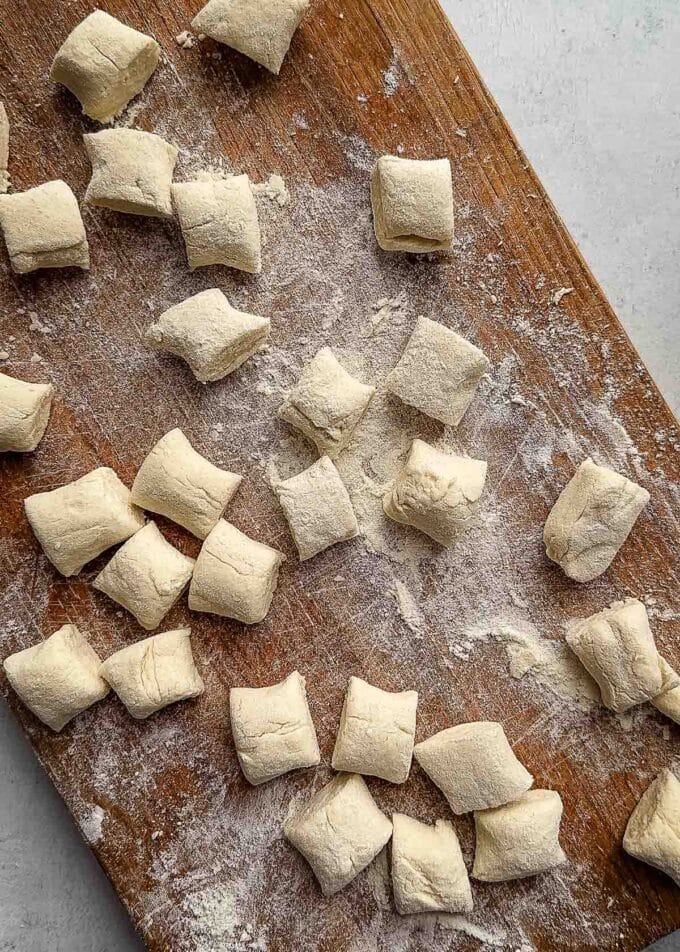 - Turn the dough out onto a lightly floured surface. Divide into sections and roll each into a rope about ¾-inch thick. Cut into ¾-inch pieces and lightly dust with flour.