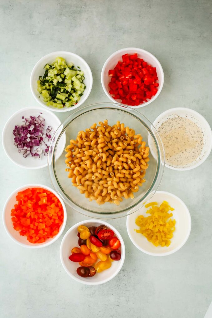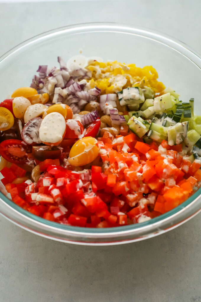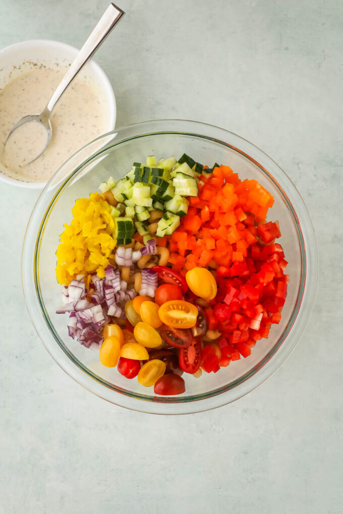 - In a large bowl, combine the pasta, bell peppers, cucumber, tomatoes, red onion, and banana peppers.