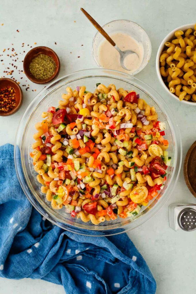 This is the kind of pasta salad I keep coming back to because it hits that perfect balance of creamy, but not heavy. The mayo adds just enough richness, while the red wine vinegar and banana peppers keep everything bright and slightly tangy.