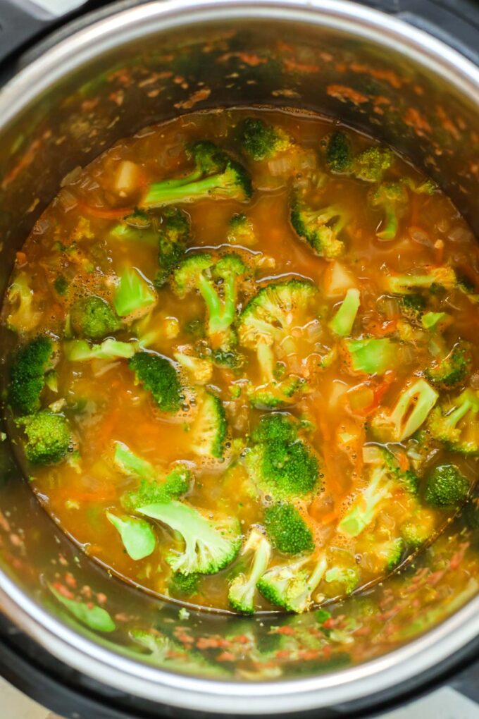 - Add the broth, broccoli, and potato, and lock the lid into place.