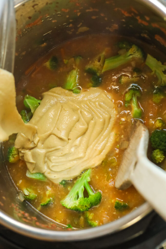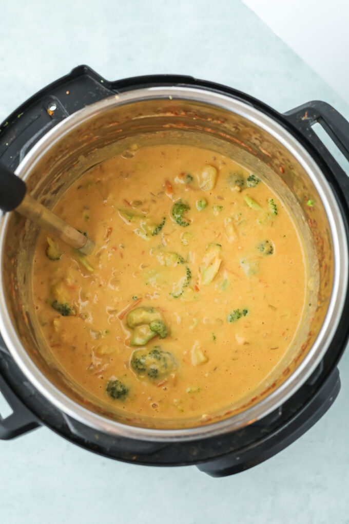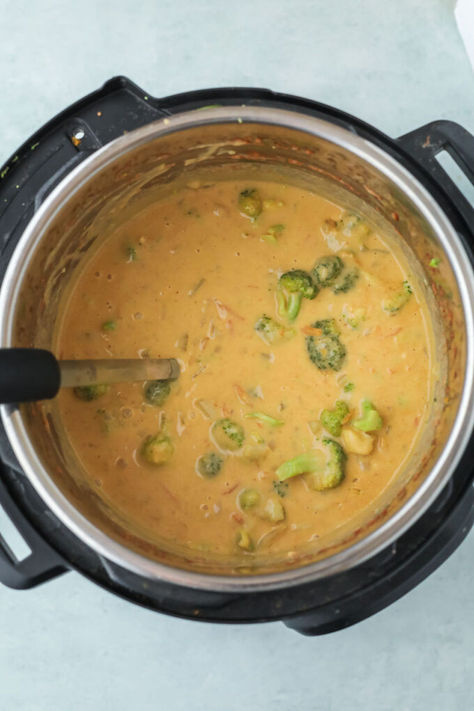 Broccoli cheddar soup is one of my favorite comfort foods, but I try to lean more plant-based when I can. When I want something just as creamy and cozy, but without any actual cream or cheese, this is the recipe I make! I originally made aย stovetop version,ย but I wanted to try a version in the Instant Pot for nights when I’m a little short on time. This recipe works great in a pressure cooker!