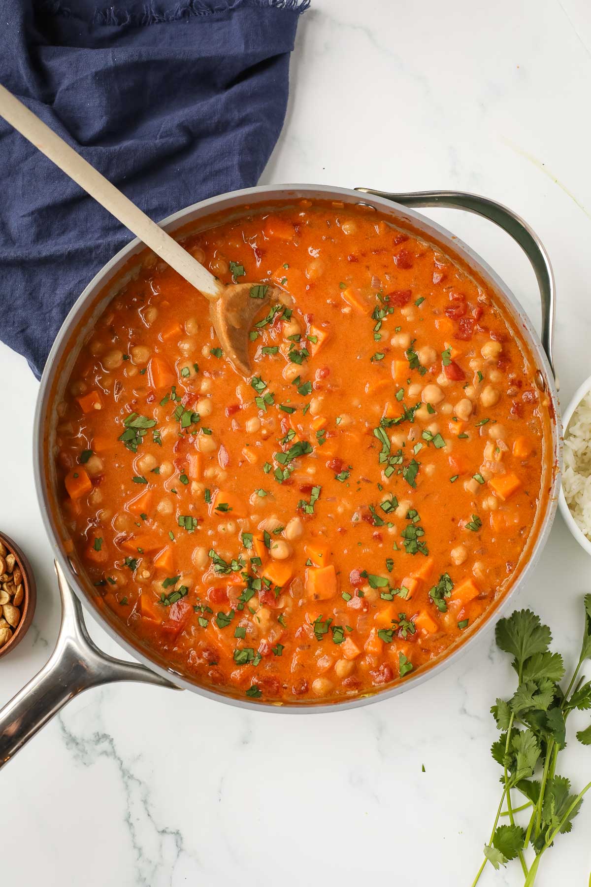 - Divide into bowls and top with peanuts and cilantro. Serve with rice, if desired.