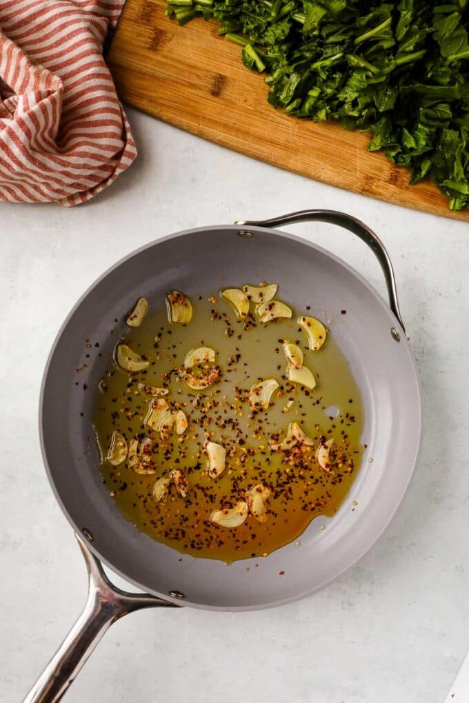 - Combine 2 tablespoons olive oil, garlic, and red pepper flakes in a Dutch oven or large skillet.