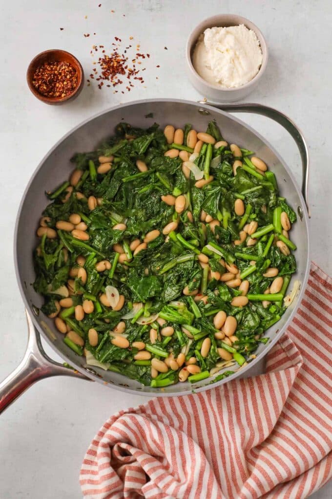 - Stir in the broccoli rabe, cannellini beans, 1/4 cup of pasta water, and ½ teaspoon salt.