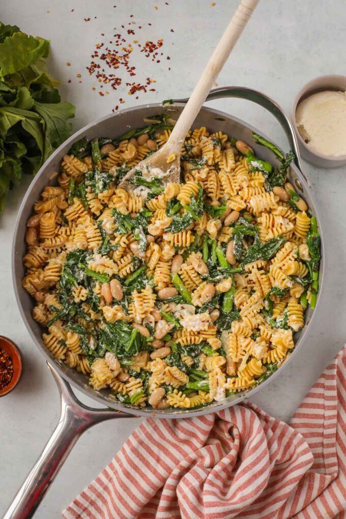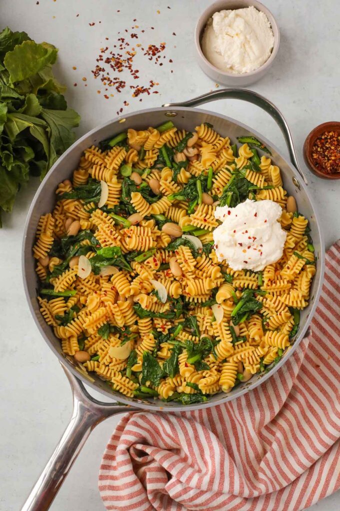 This easy rapini pasta is a simple, flavorful meal that comes together quickly for a satisfying weeknight dinner! The bitter broccoli rabe is perfectly balanced with creamy ricotta, tender white beans, and a hint of lemon for brightness.