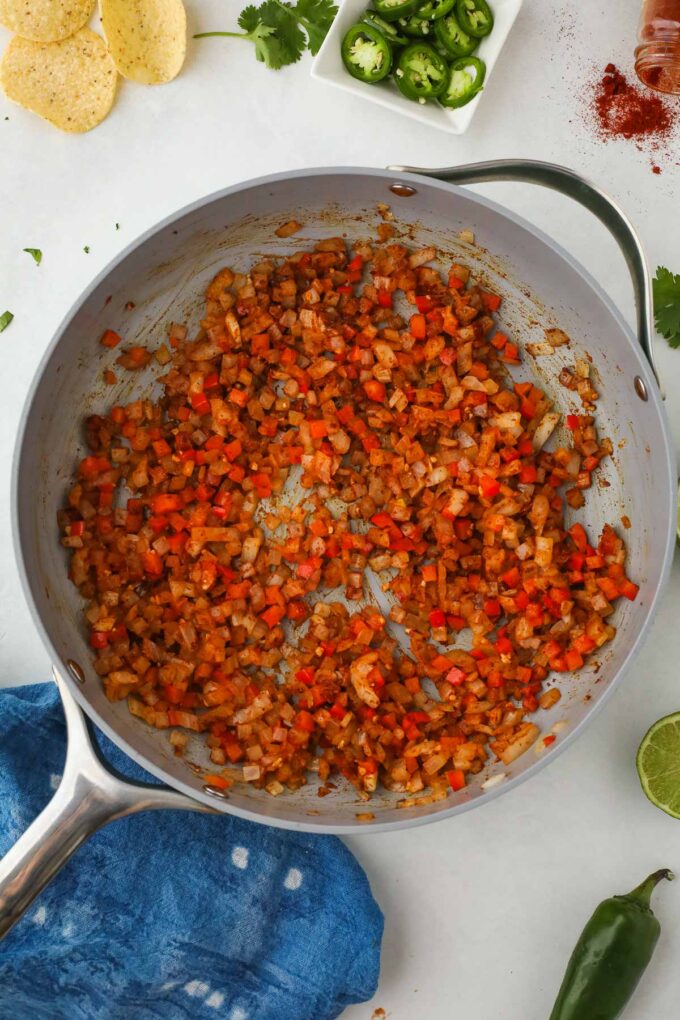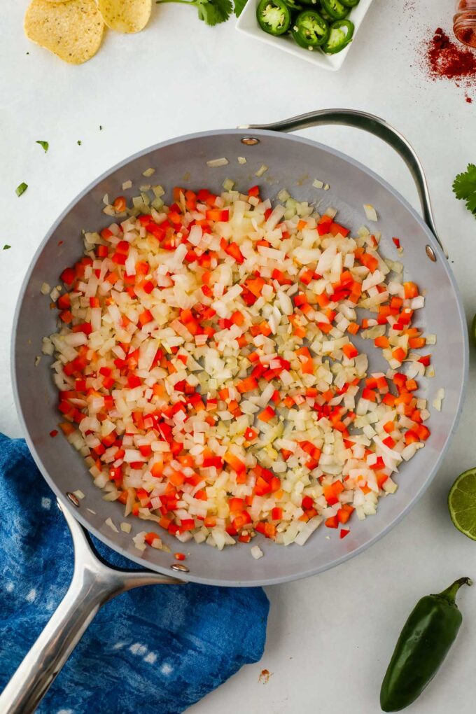 - Heat the oil in a large skillet over medium-high heat. Add the onion and bell pepper, and sautรฉ for about 5 minutes, until softened.