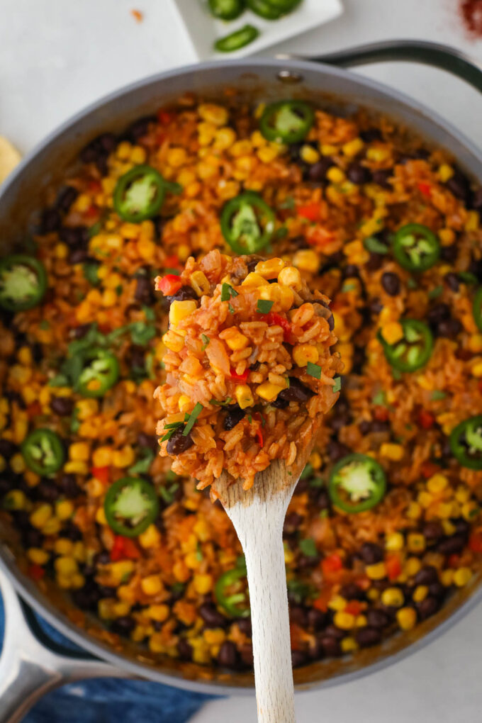 This one-pan rice and beans recipe is an easy dinner with tons of flavor. This dish is filled with veggies, plant-based protein, and fiber.