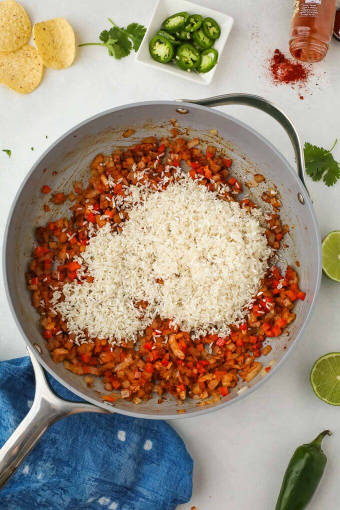 - Add the uncooked rice and stir for 1โ2 minutes to toast it lightly in the spice mixture.
