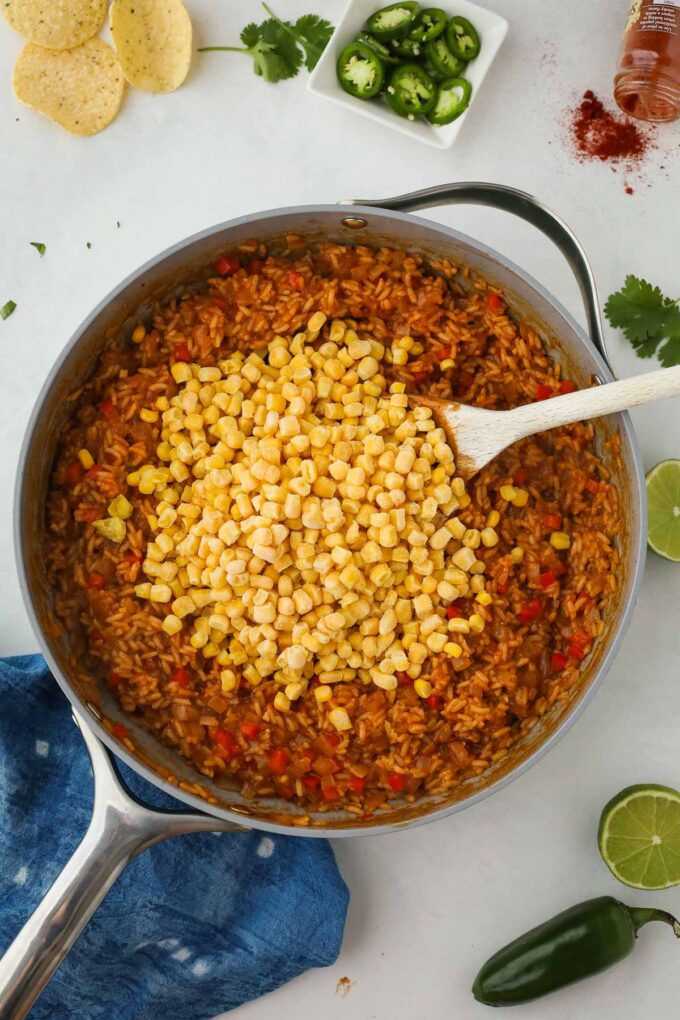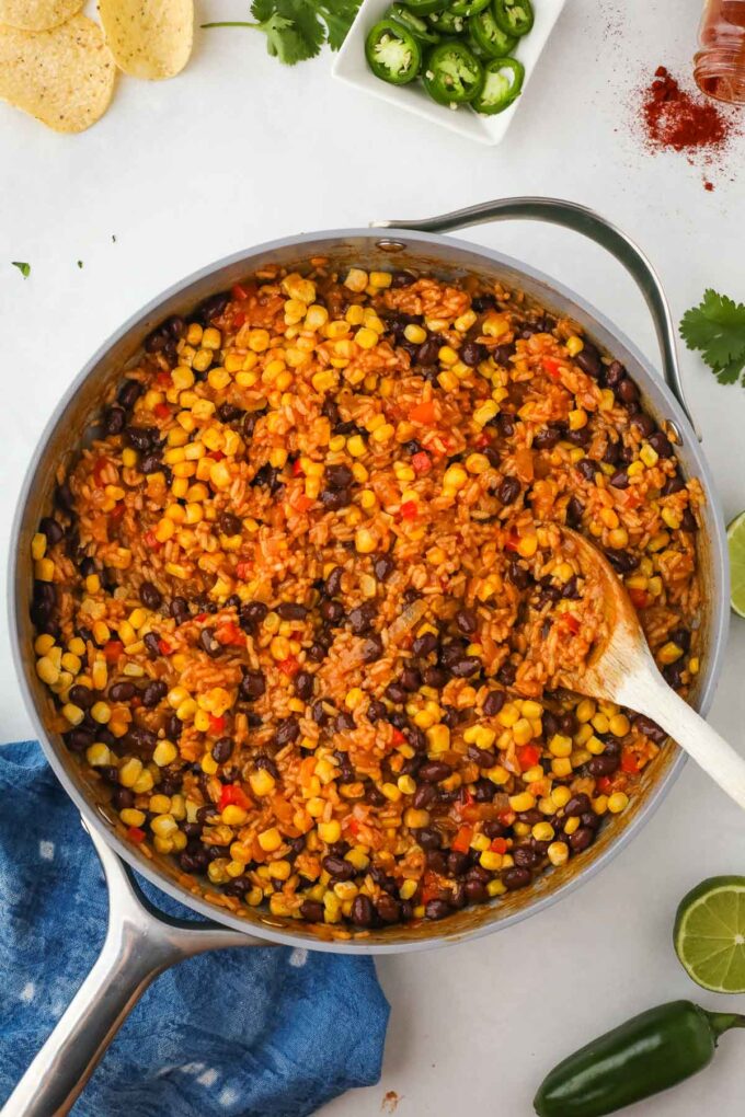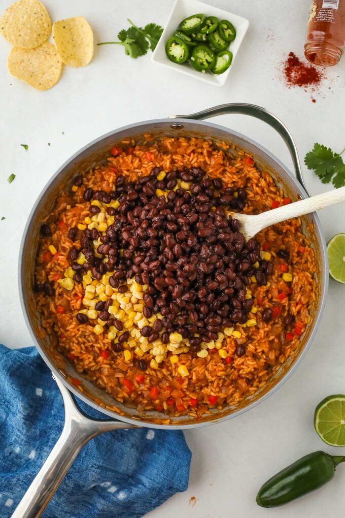 - Can I use cooked rice instead of uncooked? Yes! If using cooked rice, reduce the broth to ยฝ cup and add the rice along with the beans and corn. Heat through for 5โ7 minutes.