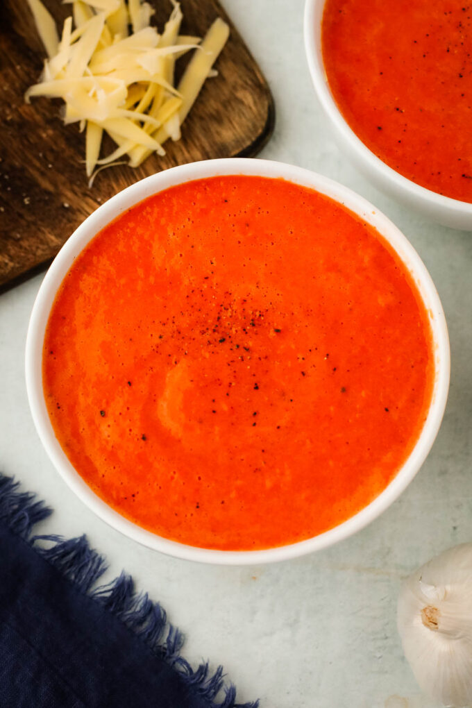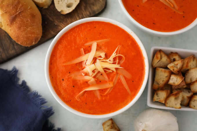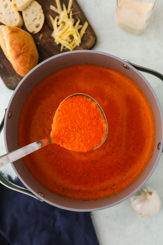 This soup is similar to a tomato soup, so I love pairing it with a simple grilled cheese, but a feta grilled cheese can take things to the next level! Or if you want to add more veggies, try my sweet potato grilled cheese.