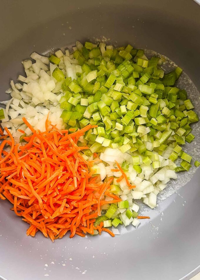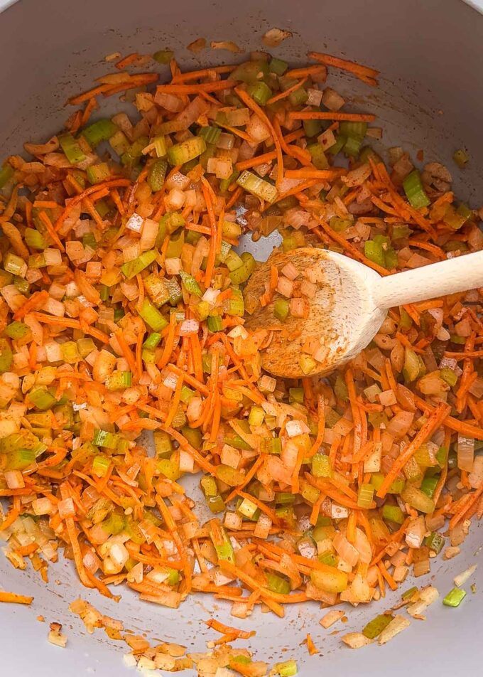 - Add onion, celery, and carrots. Cook for 8-9 minutes until soft.