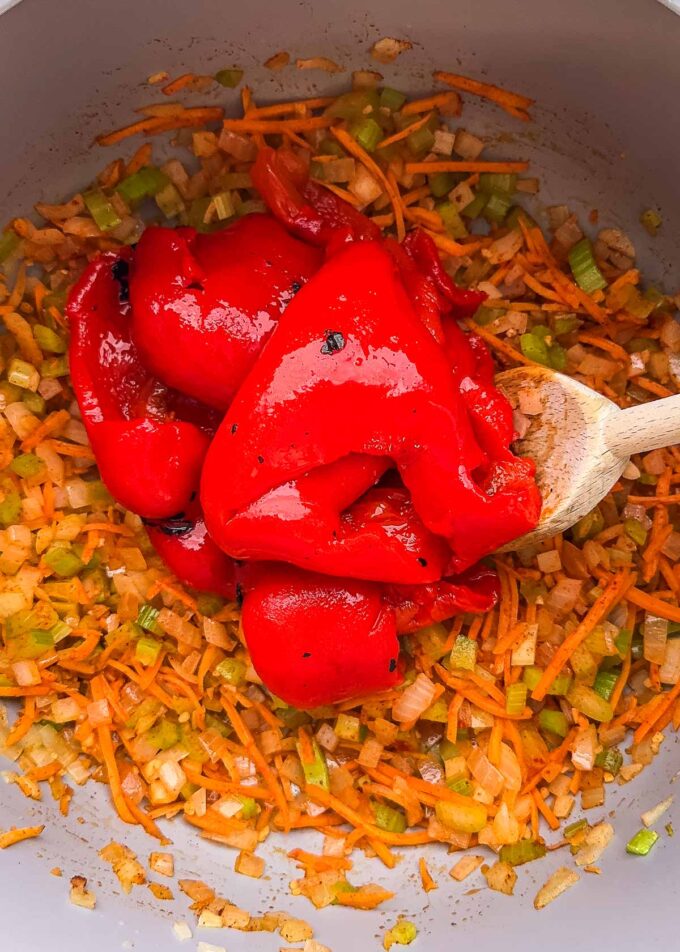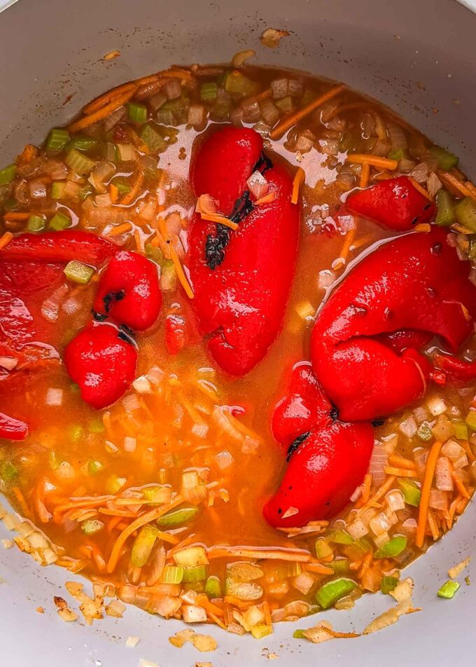 - Add roasted red peppers and vegetable broth. Bring to a simmer and cook 10 minutes.
