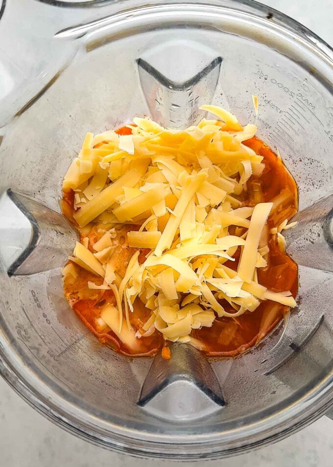 - Carefully transfer to a blender and add the smoked Gouda and evaporated milk.