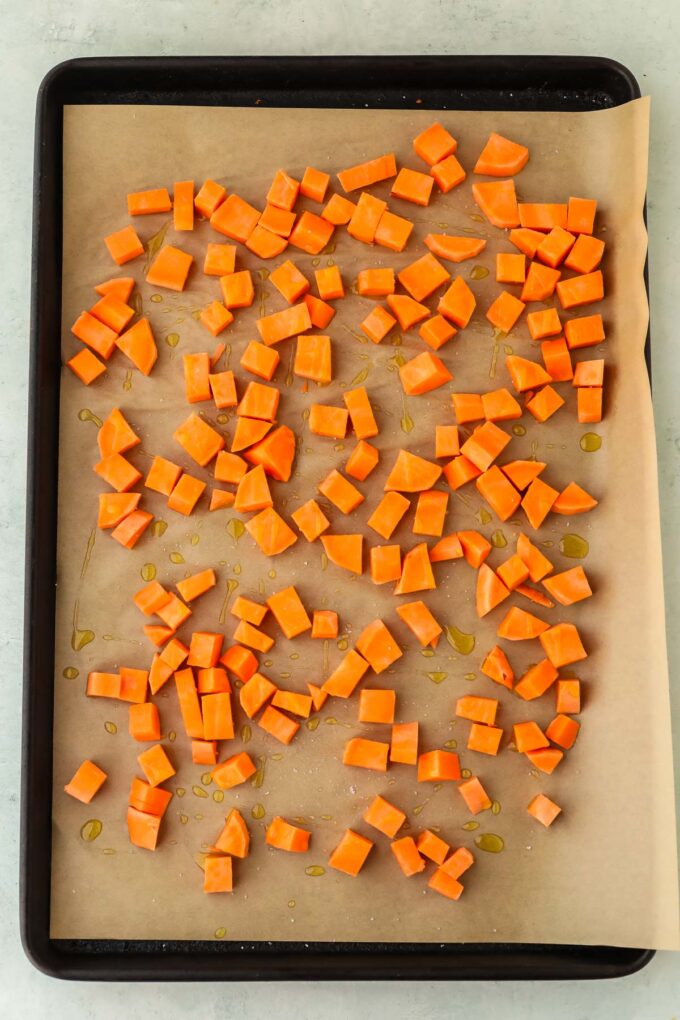 - Spread the sweet potatoes onto a baking sheet, drizzle with one tablespoon of olive oil and sprinkle with salt. Toss and spread into even layer.