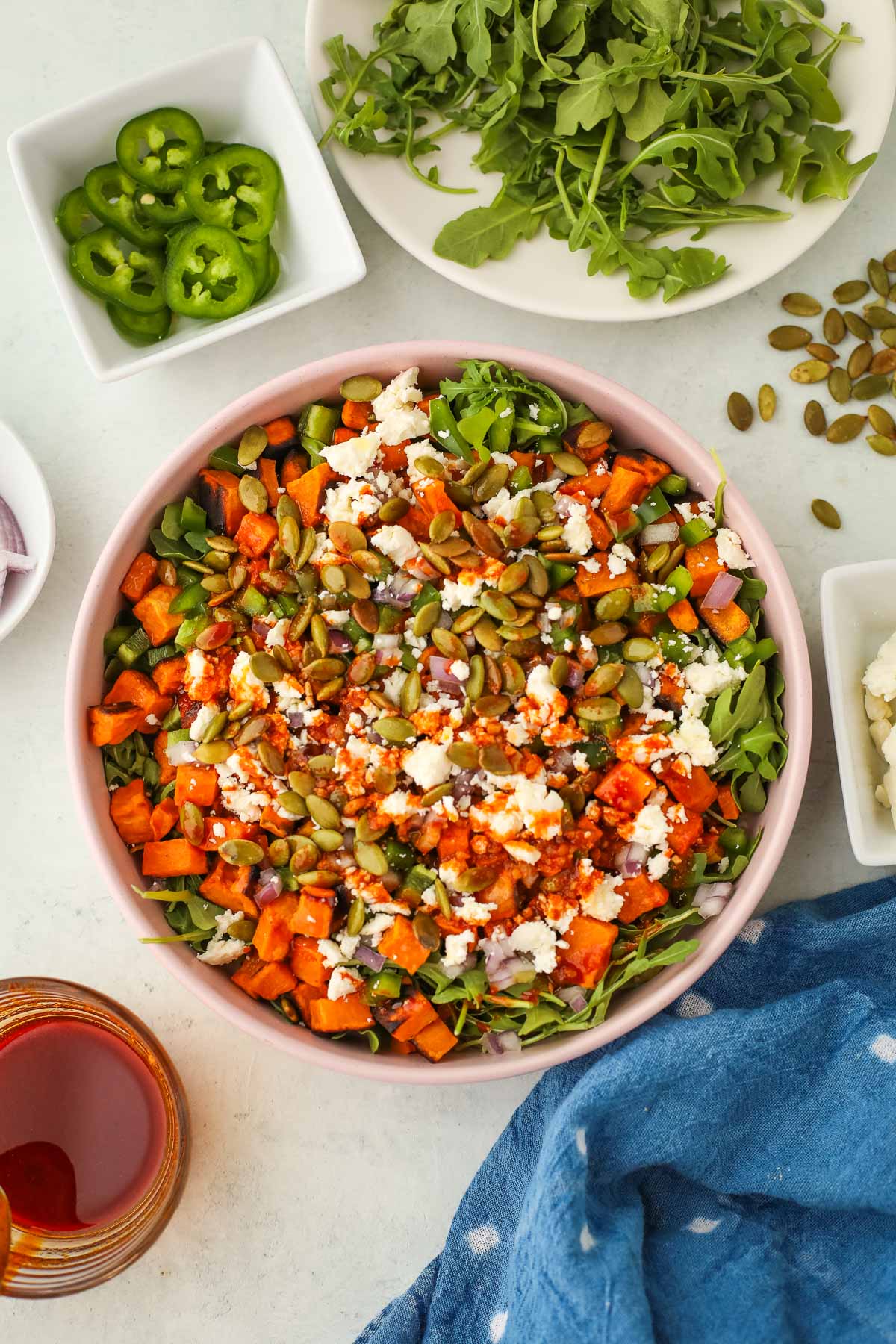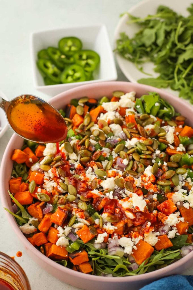 - Top with roasted sweet potatoes, jalapeño, red onion, feta, cilantro, and pumpkin seeds. Toss to combine.