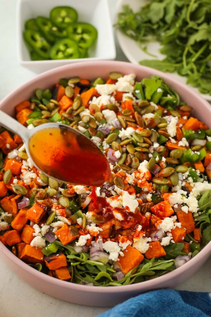 This salad keeps surprisingly well, which makes it great for meal prep. Store leftovers in an airtight container in the fridge for up to 3 days. If you’re making it ahead, you can roast the sweet potatoes and prepare the dressing in advance, then assemble everything just before serving for the best texture.