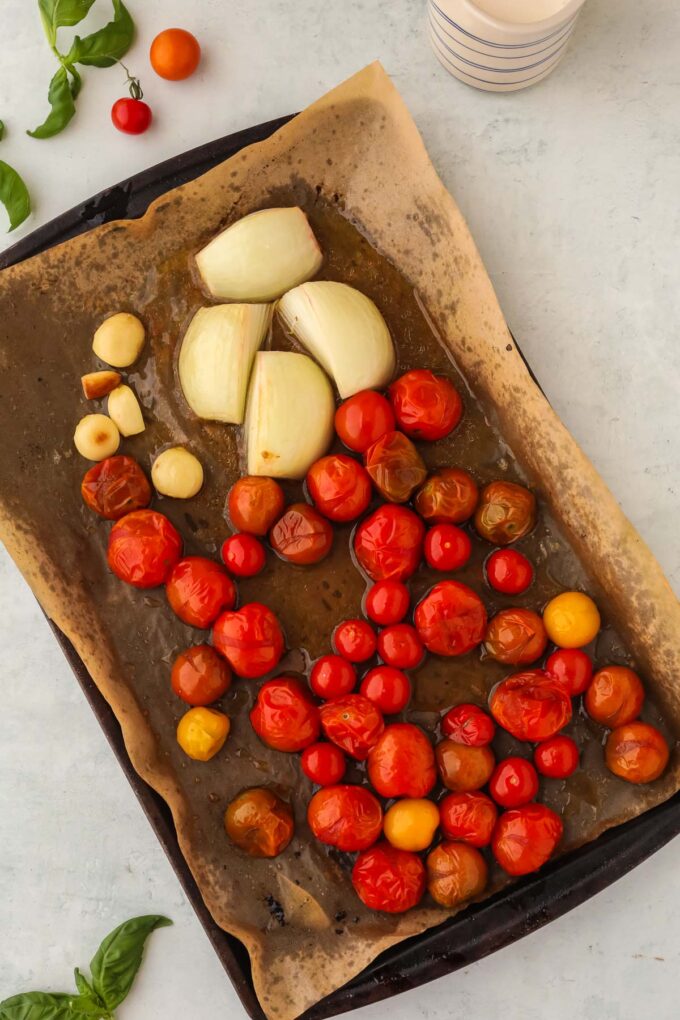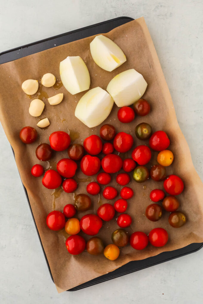 - On a large baking sheet, spread the cherry tomatoes, chopped onion, and garlic cloves.