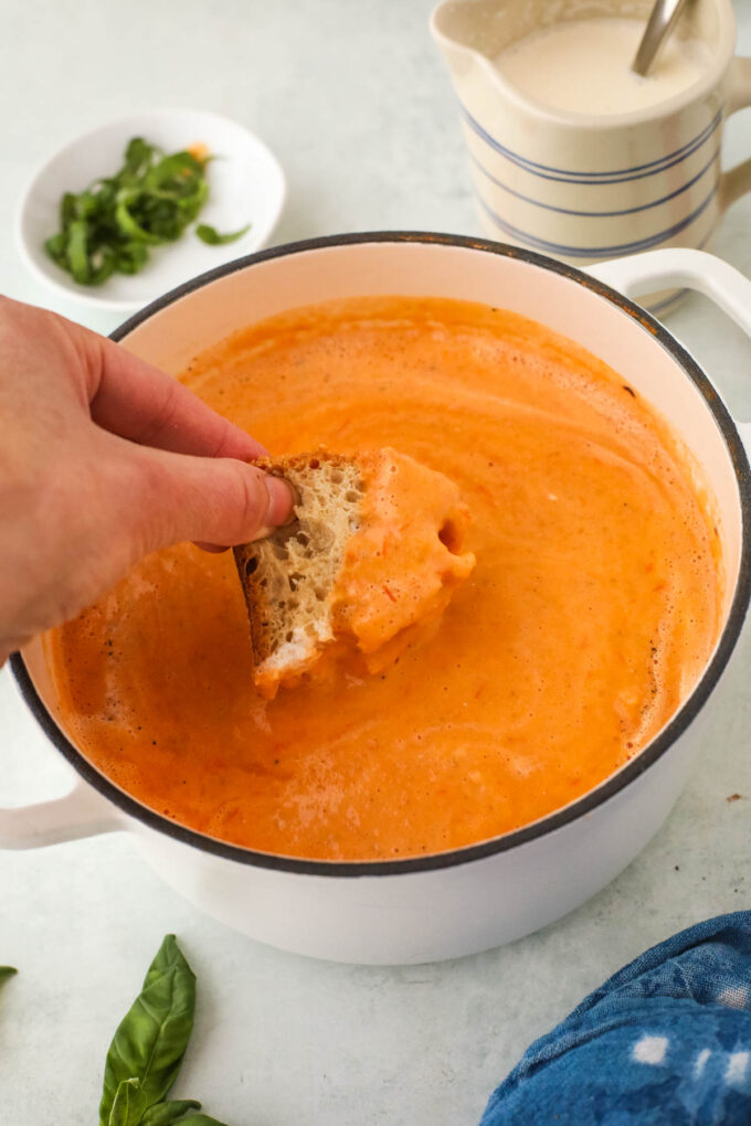 This soup pairs perfectly with a classic grilled cheese, but you can also pair it with a feta grilled cheese or sweet potato grilled cheese. You could also serve it with crusty bread for dipping or swirl in a little pesto for a fancy touch.