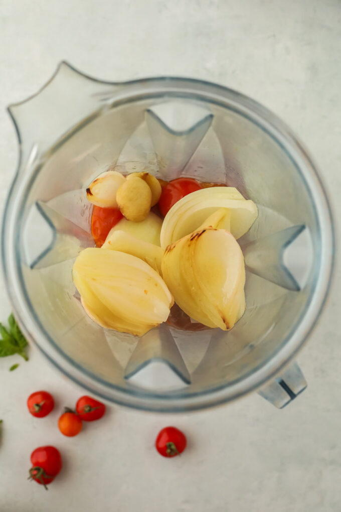 - Once roasted, transfer everything to a blender or food processor and add the vegetable broth. Blend until smooth and creamy. Be careful blending hot soup. See notes for more details.