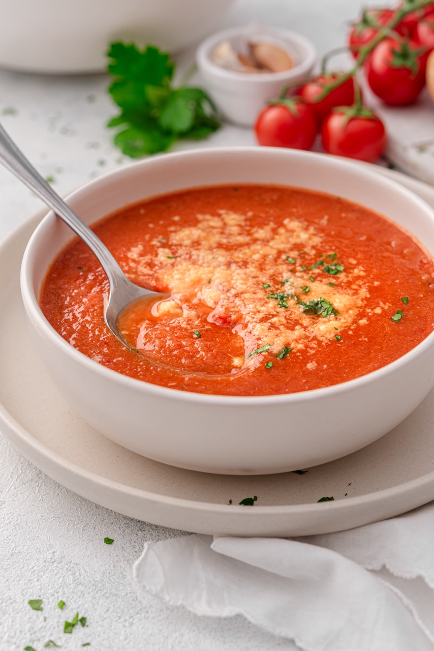 Let the soup cool to room temperature, then store it in an airtight container in the refrigerator for up to 4 days. Reheat gently on the stovetop or in the microwave, stirring occasionally. If it thickens too much, just add a splash of broth or water. This tomato soup can be frozen, but it’s best if it’s frozen without the addition of heavy cream. So, if you are making it with plans to freeze it for later use, store it in an airtight container without the cream for up to 3 months.