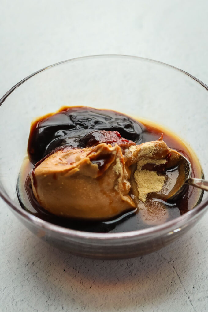 - In a large bowl, whisk together the gochujang, rice vinegar, peanut butter, hoisin, soy sauce, sesame oil, garlic powder, and lime juice.