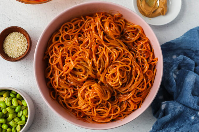 These spicy peanut noodles are made with gochujang for a flavorful sauce that has just the right amount of heat. Toss it with your favorite noodles and you have dinner ready in 15 minutes!