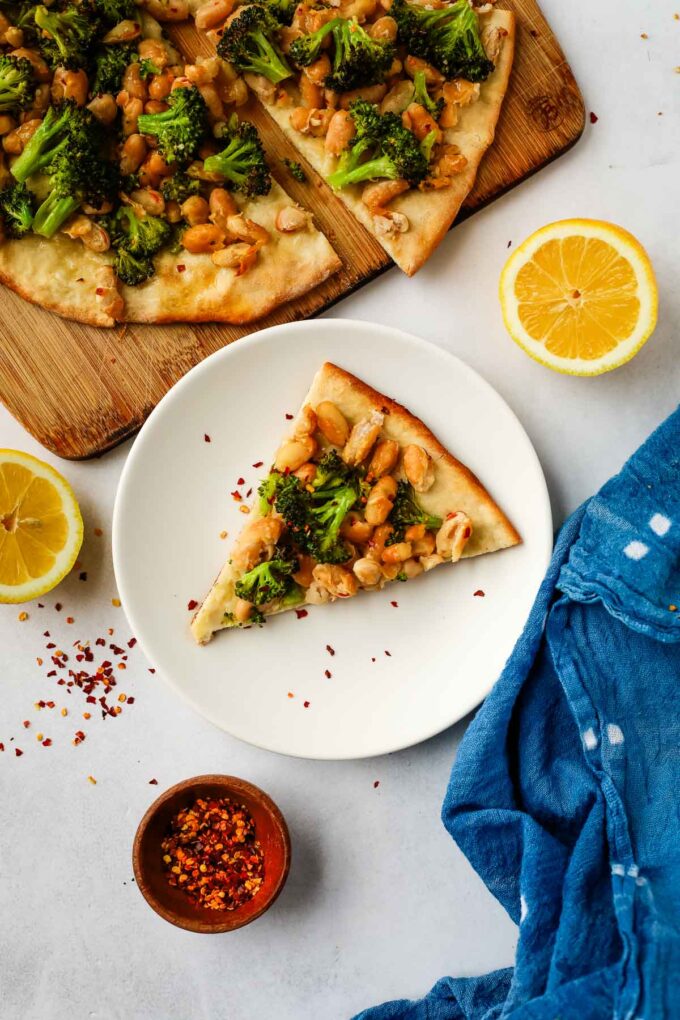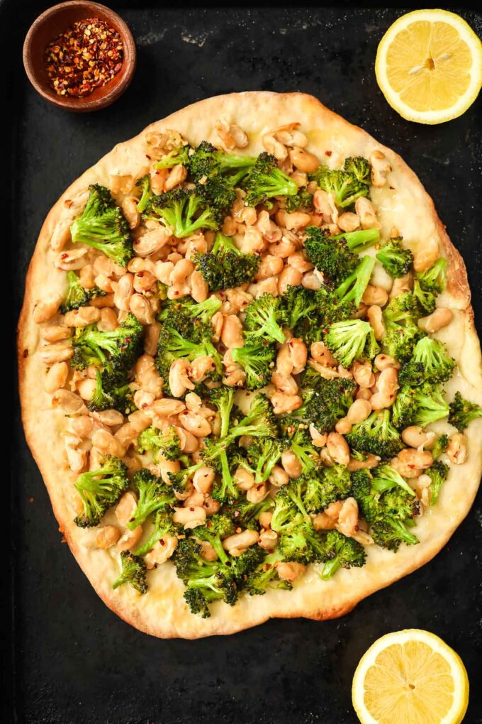 Sometimes you want pizza… but you also want something that feels a little lighter and packed with vegetables. That’s exactly why I love this vegan broccoli pizza. This pizza was inspired by one of my favorite local restaurants, 8 1/2. They have a vegan white bean pizza that is similar to this one, except it’s made with broccoli rabe. I’ve made it both ways, but since broccoli rabe is a little harder to find, I decided to use regular broccoli.