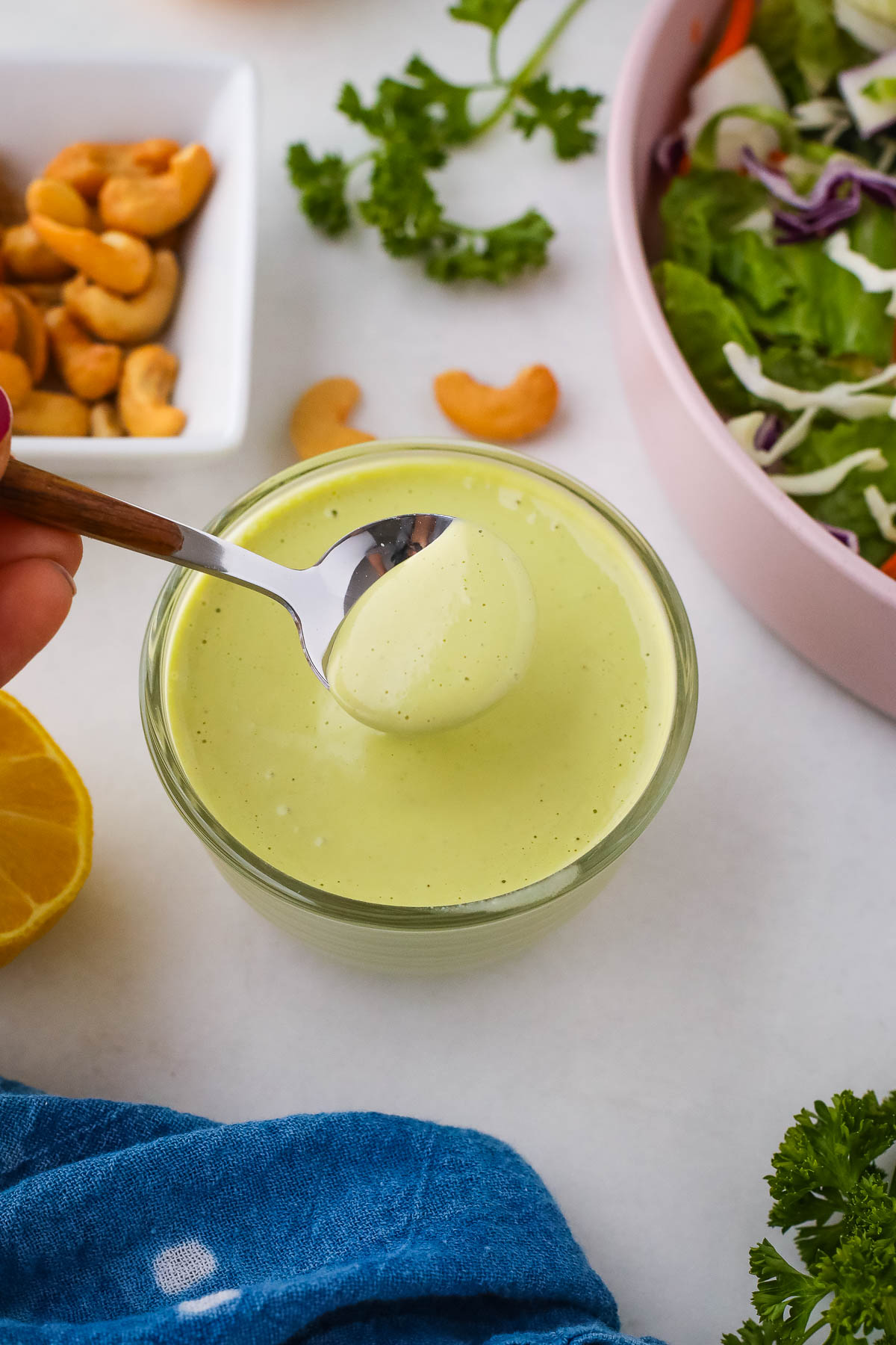 • Use a high-speed blender if possible. A high-powered blender makes it easier to get a perfectly smooth dressing. If you don’t have one, you may want to soak your cashews overnight so they’re easier to blend.