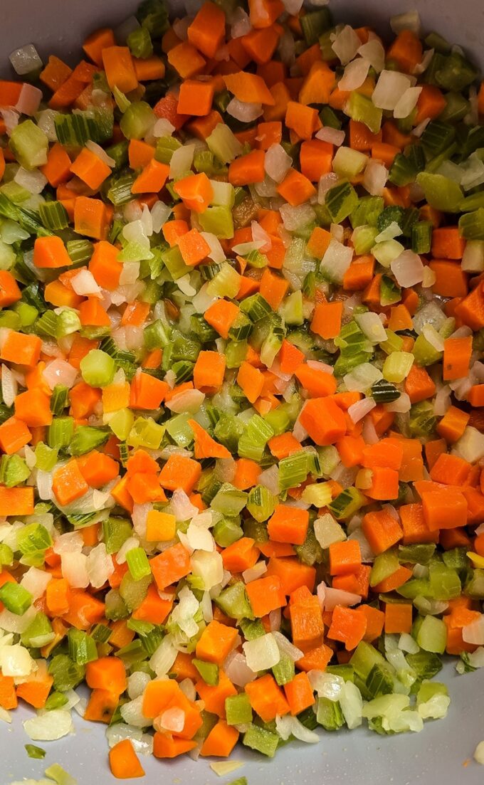 - In a large pot add the olive oil over medium-low heat. Add the onion, carrot and celery and cook, stirring occasionally until softened, but not browned โ about 6 minutes.