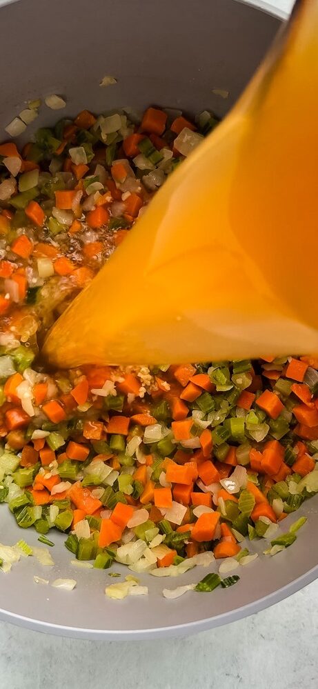 - Vegetable broth forms the base of the soup. Low-sodium broth lets you control the seasoning.