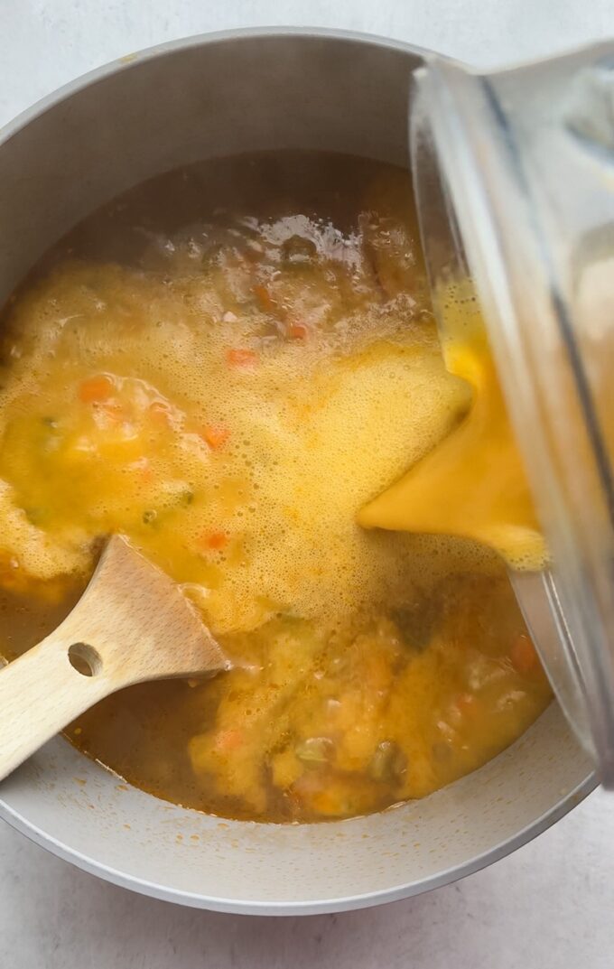 - Carefully transfer 3 cups of soup to a blender with the miso paste and nutritional yeast. Blend until smooth then transfer back to the pot. (Be careful when blending hot soup. Do not blend in a bullet style blender. Allow steam to safely escape through a vented lid.)