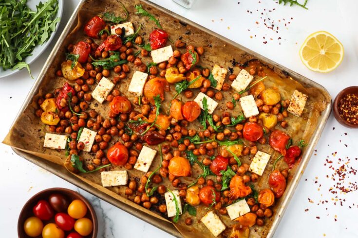 This sheet pan recipe combines crispy chickpeas, jammy roasted tomatoes, and salty feta for a dinner that is easy and delicious! I love how simple this one is, but the flavor combination is incredible! I
