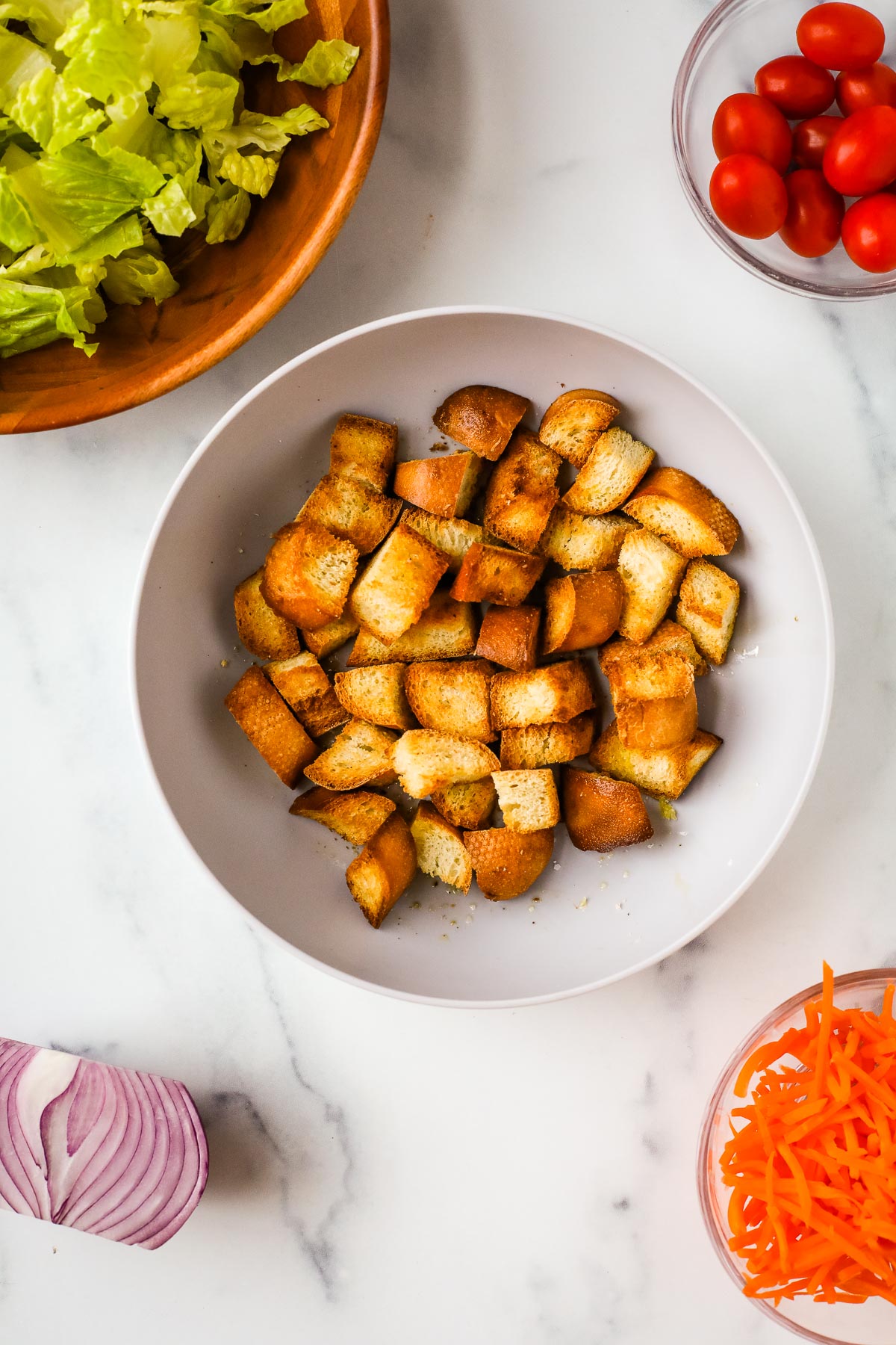 These crispy croutons are made in the air fryer for an easy, delicious way to repurpose leftover bread. These croutons are a tasty topping for soups and salads!
