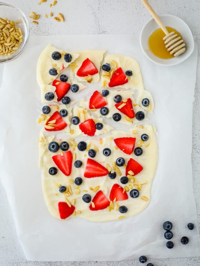 This frozen yogurt bark is topped with fresh berries and crunchy almonds for an easy snack you can keep in the freezer. It’s perfect for a high protein, kid-friendly treat!