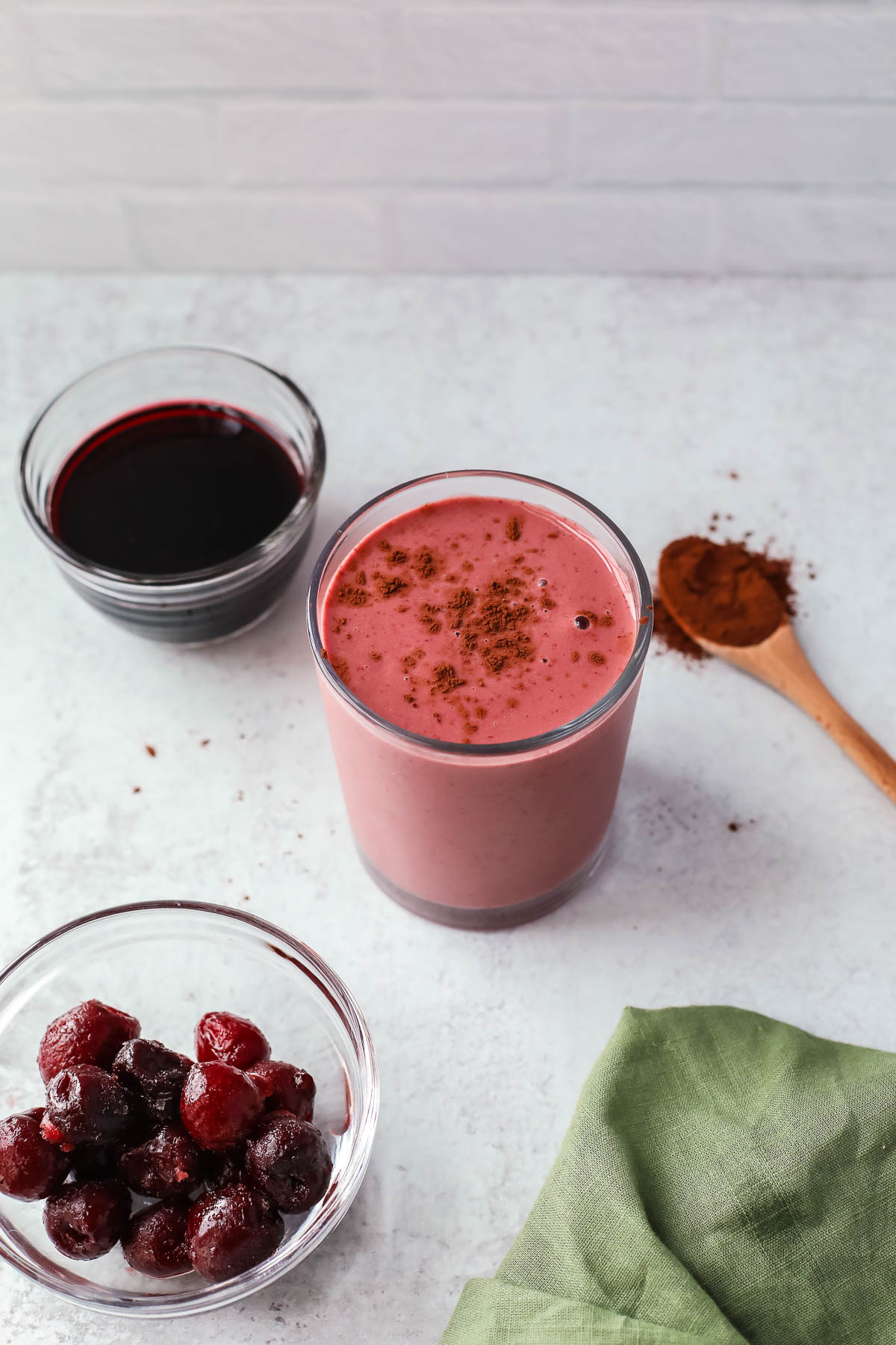 This chocolate-covered cherry smoothie recipe is a delicious balance of sweet and tart flavor with a hint of chocolate.