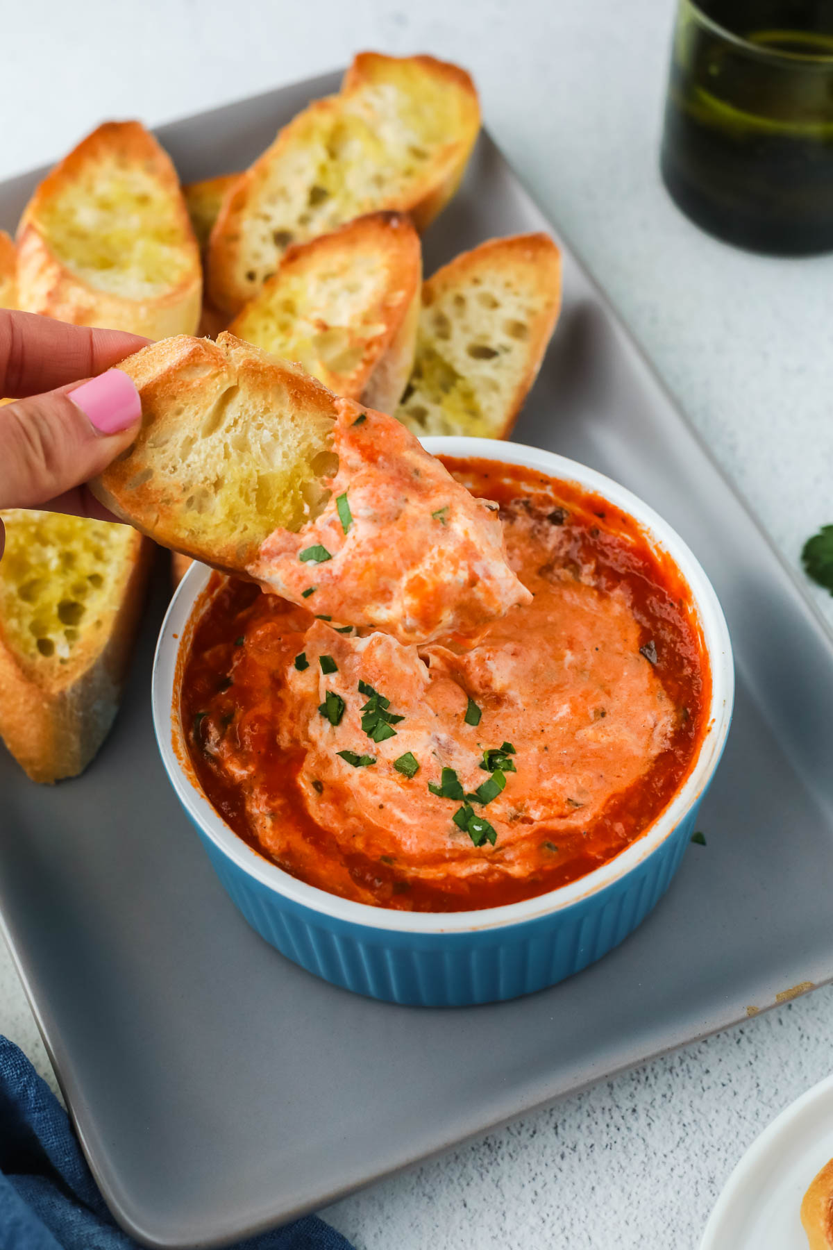 This baked goat cheese dip is made with just 4 ingredients! This creamy dip is perfect to serve with a toasted baguette for dipping.
