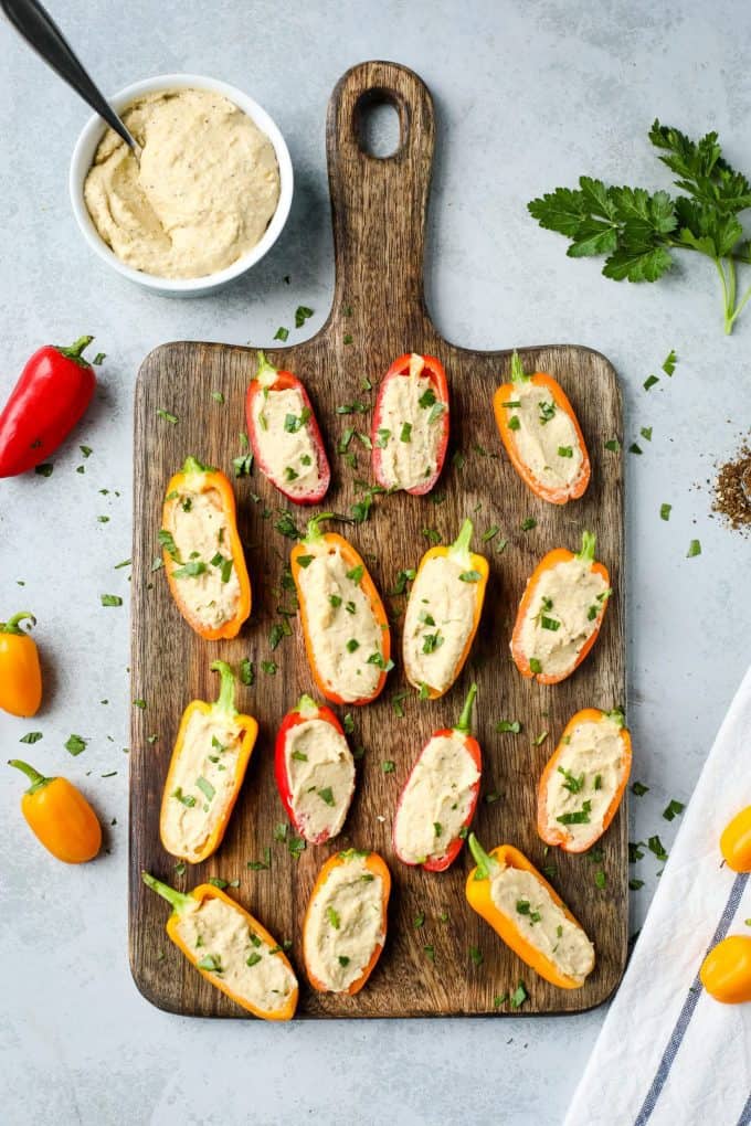 Sweet mini-peppers are stuffed with creamy hummus for a deliciously simple bite-sized finger food! These are perfect for a healthy appetizer or after school snack!
