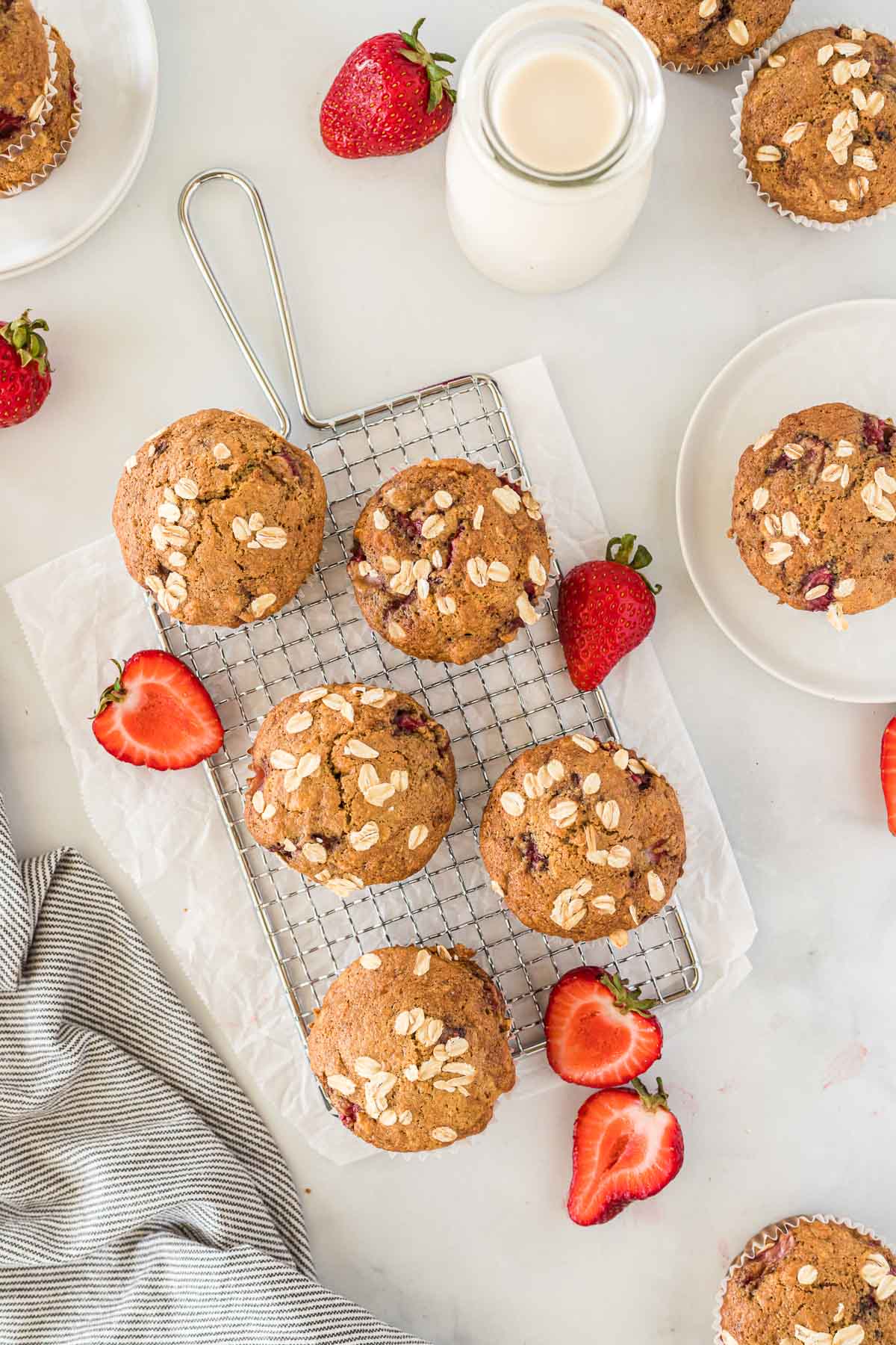 You'll need: whole wheat flour, strawberries, coconut sugar or brown sugar, eggs, coconut oil or butter, rolled oats, vanilla extract, almond extract, almond milk, baking powder, baking soda, and salt.